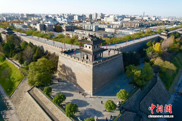 11月24日,陕西西安,冬季温阳停的乡墙根,市平易近们集合正在此戚忙文娱。图为乡墙1角。(无人机相片)中新社记者 弛遥 摄